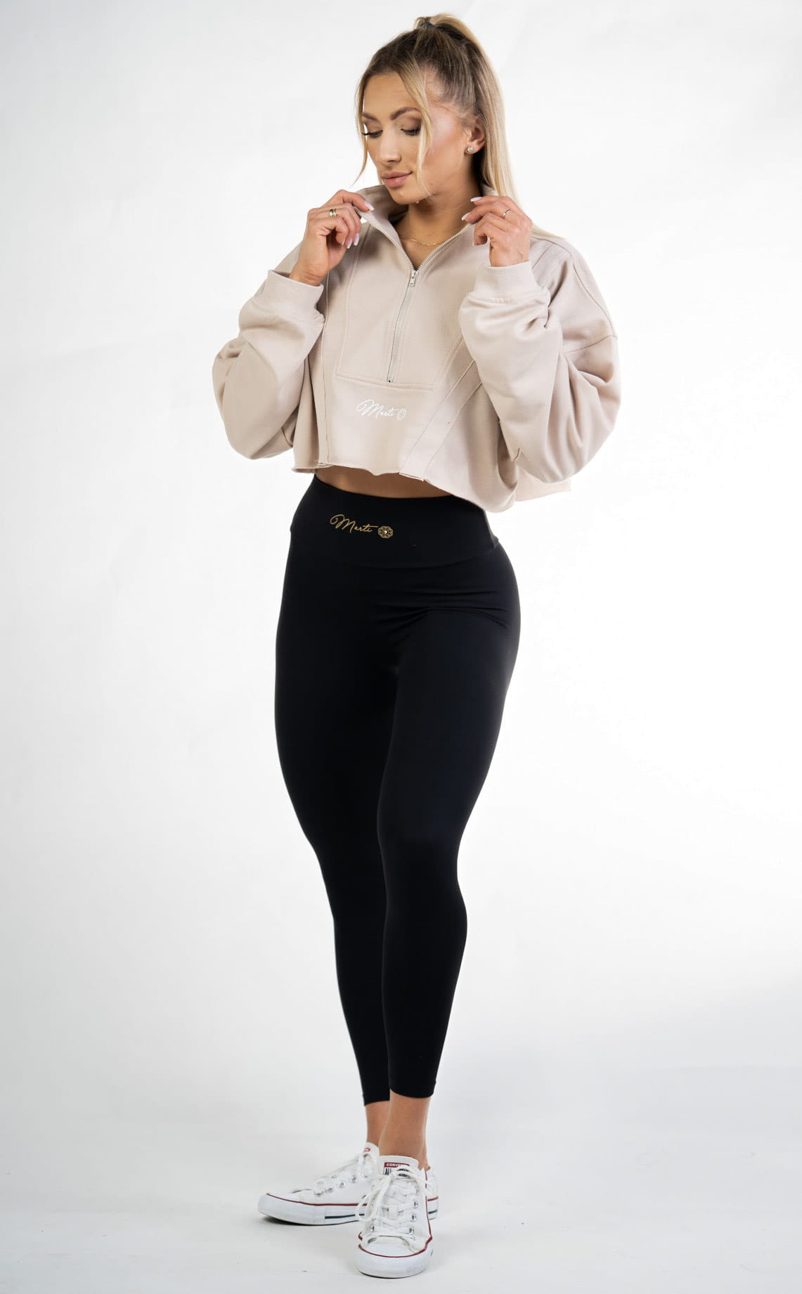 A loose sweatshirt with a zipper, fashionable stand-up collar and a white Marti logo.