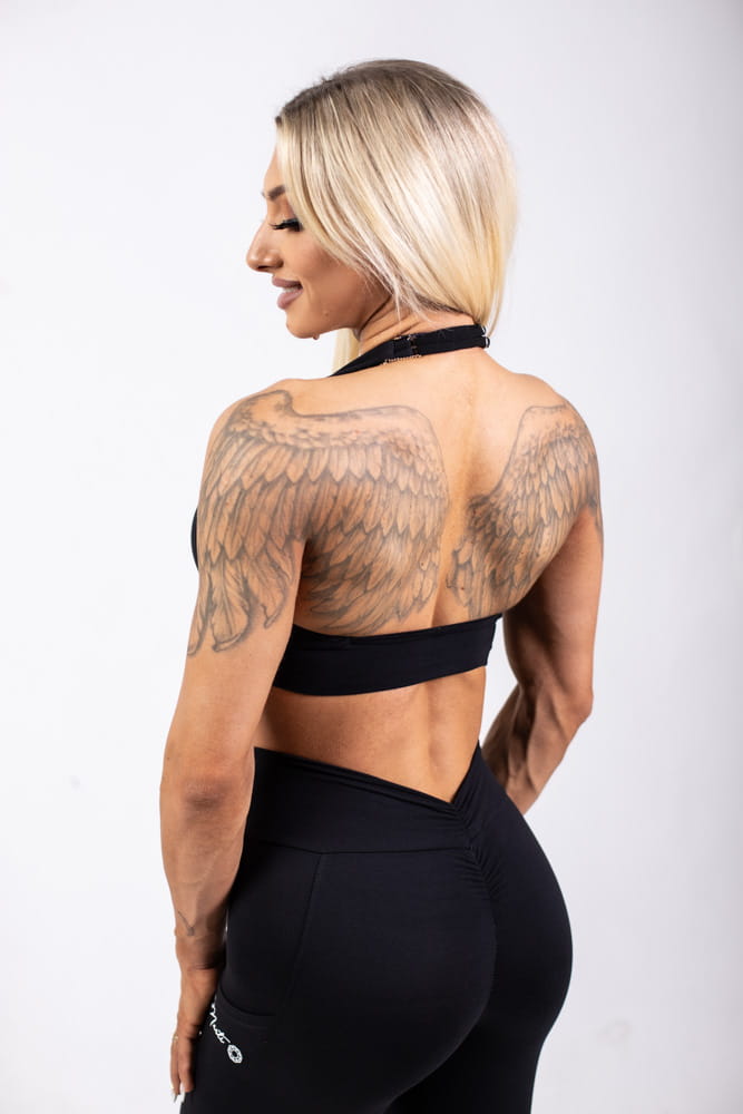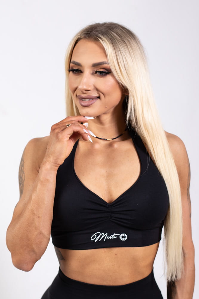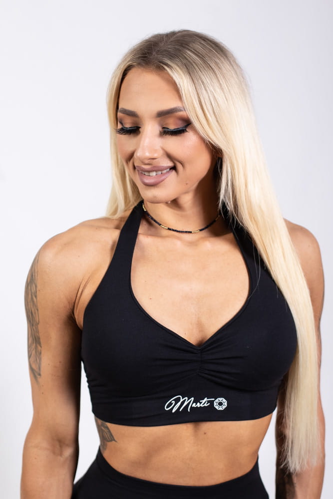 Top with thicker neck straps and a gathered front, which nicely emphasizes the shape of the bust. There are removable inserts inside.