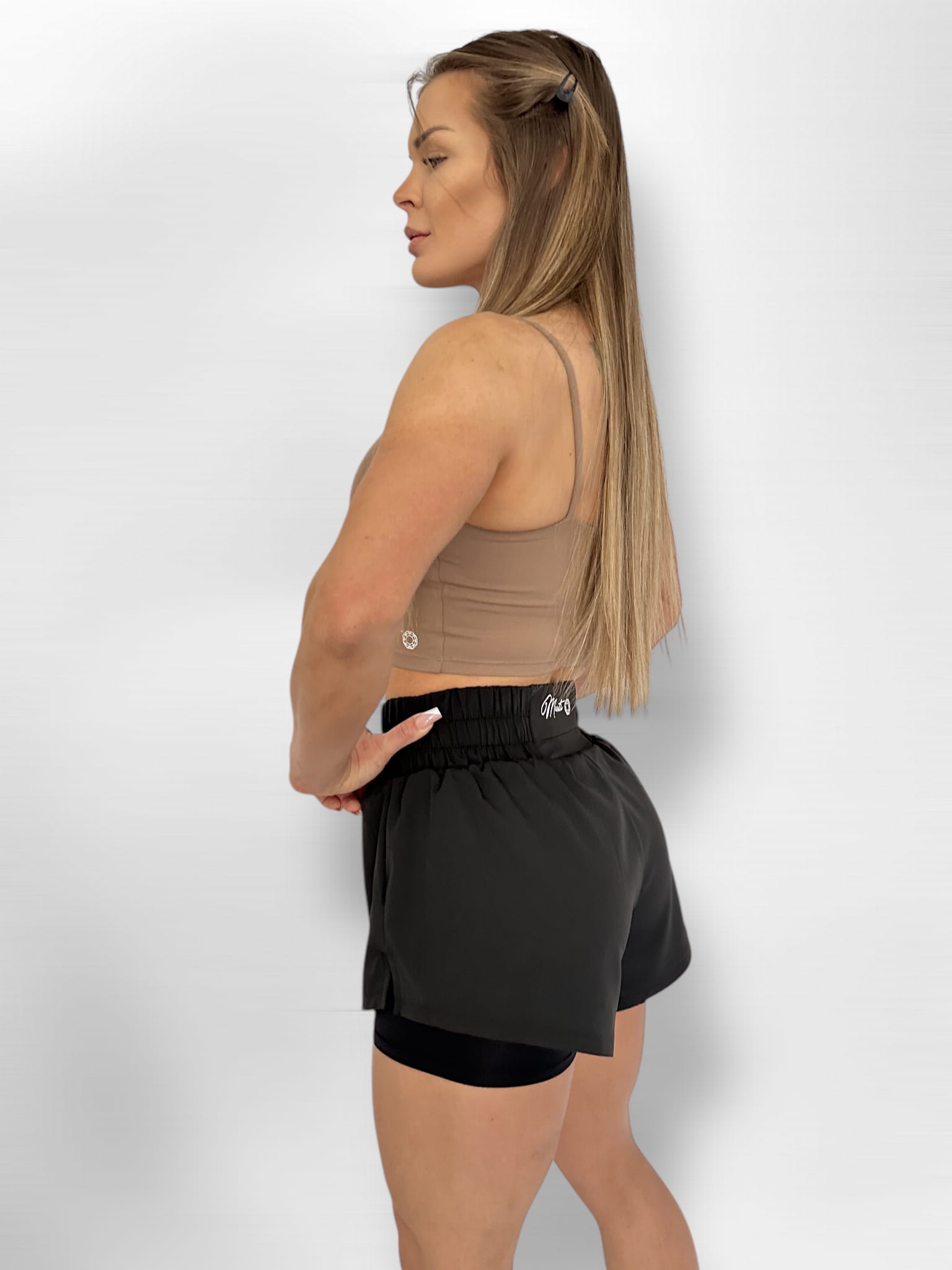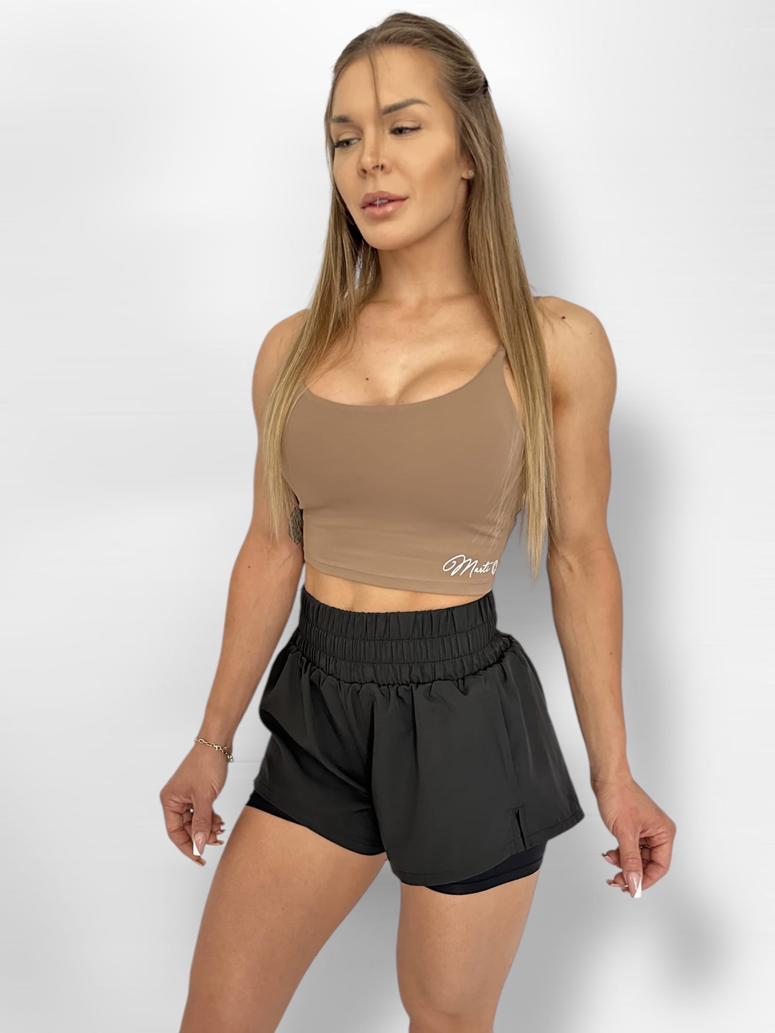 Push-up shorts have been designed with a wrinkling insert between the buttocks, because of this they are beautifully emphasized, and the back of the waist is decorated with the "Marti" logo with a shiny crystal.