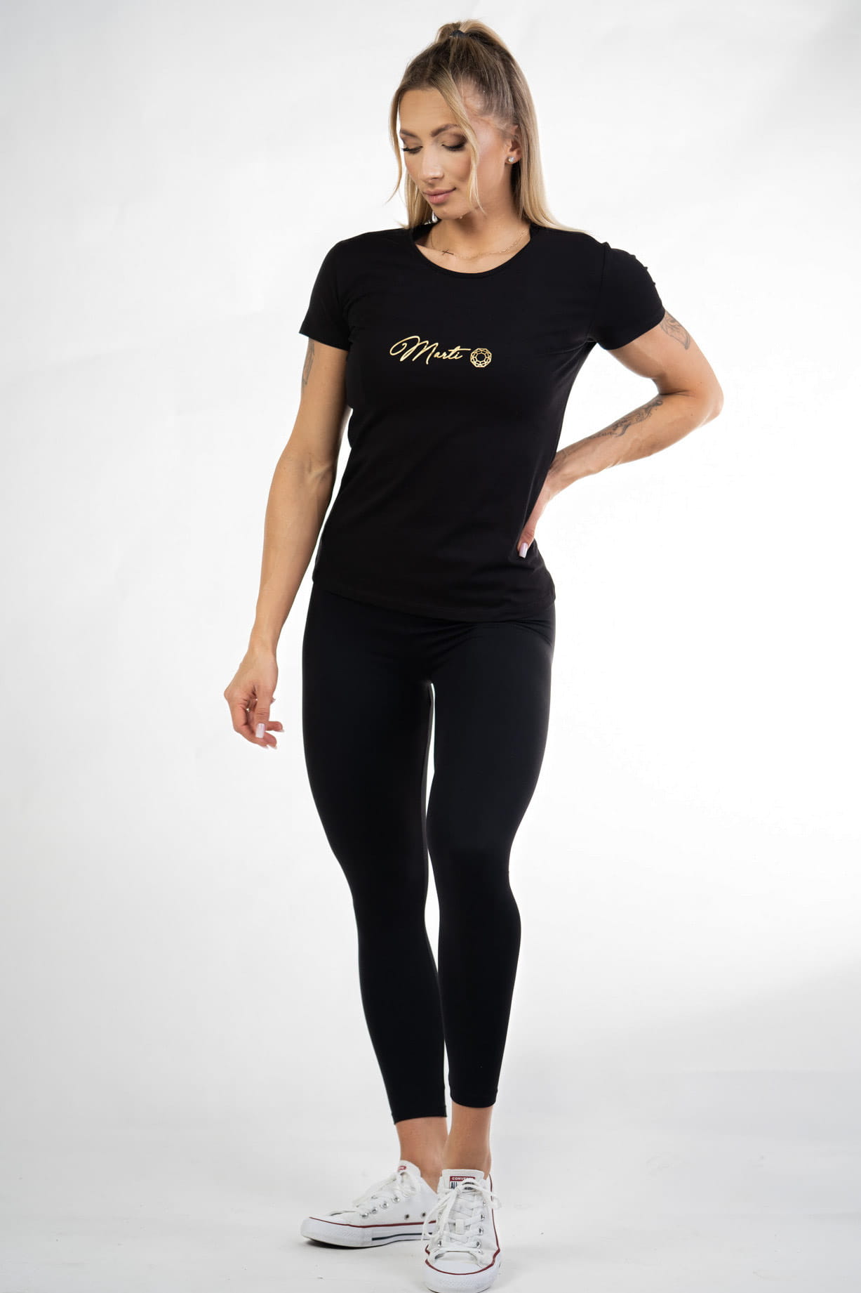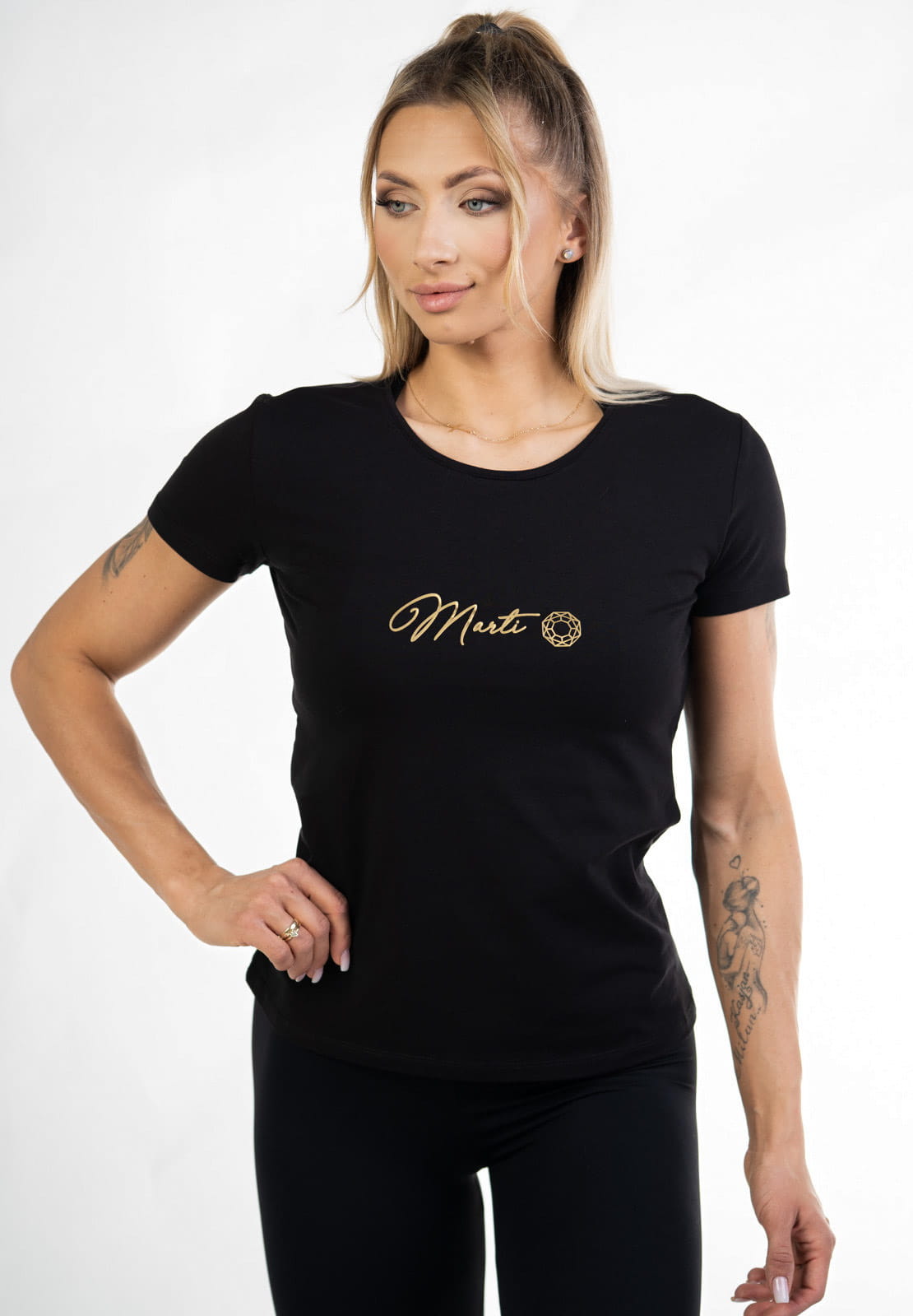 Czarny t-shirt ze złotym logo Marti. Damski taliowany krój wykonany z bardzo dobrej jakości bawełny z dodatkiem elastanu.